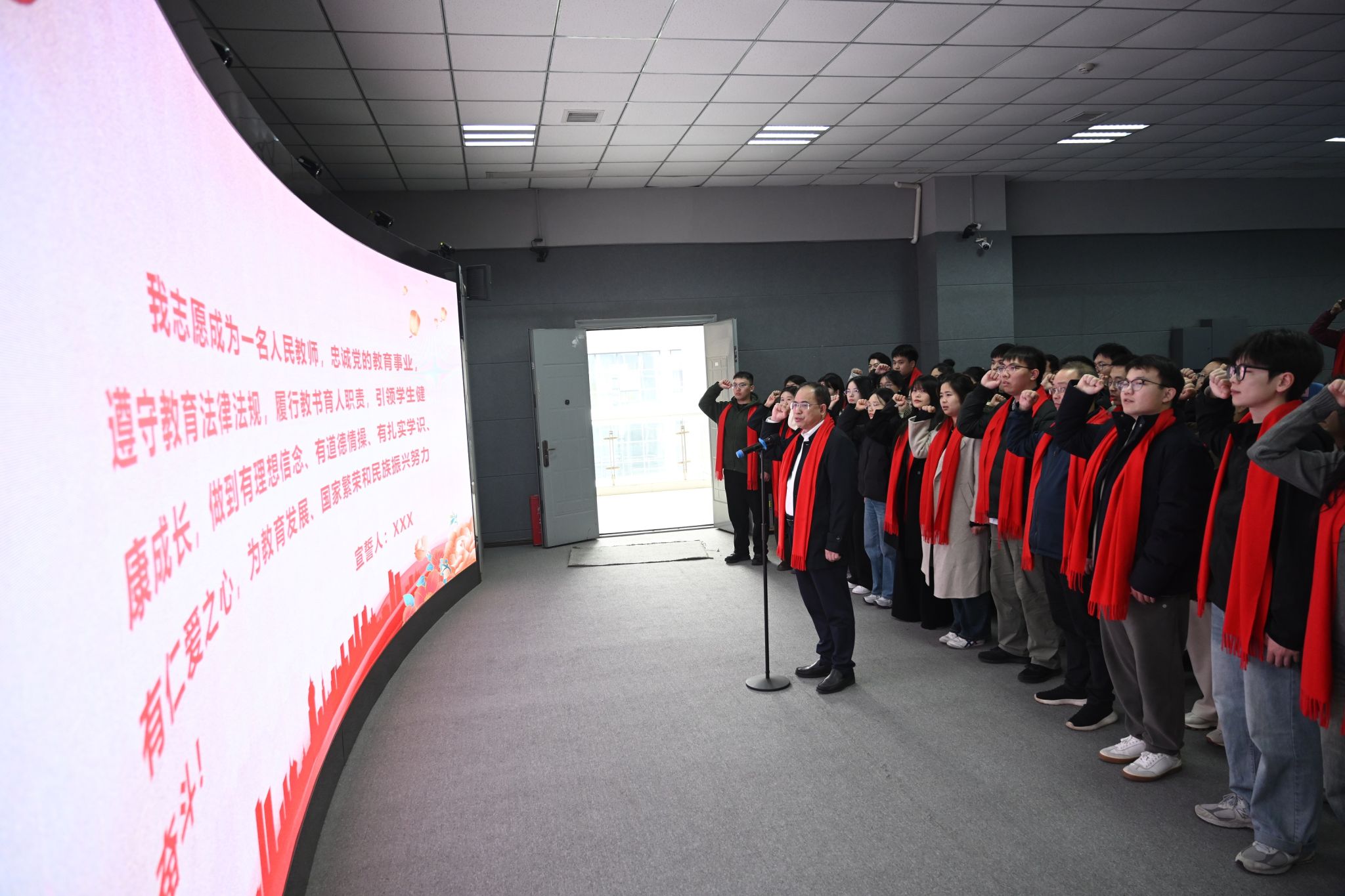 校党委书记何振带领全体新进教师庄严宣读教师誓词,铿锵誓言彰显了为党育人、为国育才的初心与决心。全体校领导为新进教师代表佩戴校徽,标志着他们正式成为开云在线开户首页/登录/入口大家庭的一员。