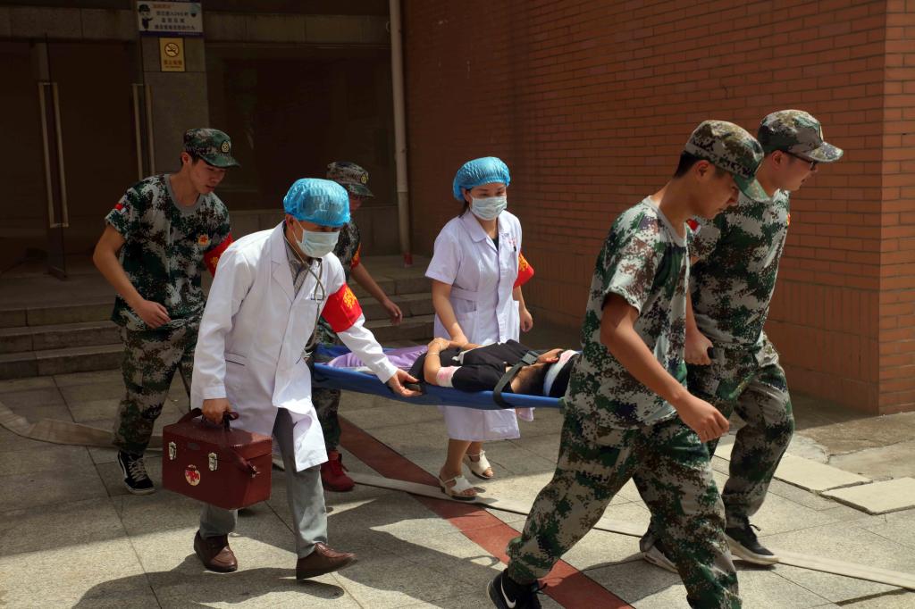 中午12:20,火灾应急疏散逃生演练正式开始。随着一声哨响,工作人员在第二教学楼内点燃了烟雾弹。不一会儿,滚滚浓烟充斥着楼道,随后刺耳的消防警报声响起。5000余名新生用随身携带的湿毛巾捂住口鼻,在义务消防员的指引下低姿势快速撤离“起火”建筑物,迅速撤离至应急避难场所。与此同时,搜救队分层对被困人员进行了搜救,益阳市公安消防特警大队消防救援车辆也赶到现场,利用水枪开展灭火作业,并依靠登高消防车对高处被困人员进行营救。