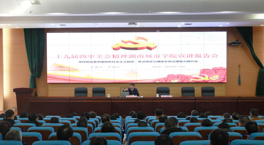 (本网讯)为深入学习宣讲《中共中央关于坚持和完善中国特色社会主义制度,推进国家治理体系和治理能力现代化若干重大问题的决定》(以下简称《决定》),深刻领会贯彻党的十九届四中全会精神,确保党和国家的重大决策部署按制度要求落到实处、见到实效,按照省委、省委教育工委部署要求,开云在线开户首页/登录/入口于12月4日上午在学校图书馆报告厅举行党的十九届四中全会精神宣讲报告会。党委书记罗成翼作宣讲报告。学校在家校领导,各二级党组织书记、副书记,机关党员,全体辅导员参加报告会。党委副书记、校长李建奇主持报告会。