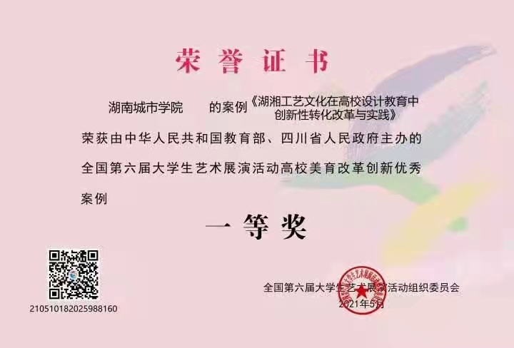 本网讯(通讯员 郑学达)2021年5月12日,由教育部、四川省人民政府共同主办的第六届全国大学生艺术展演活动在成都城市音乐厅落下帷幕,我校美育改革创新案例《湖湘工艺文化在高校设计教育中创新性转化改革与实践----以开云在线开户首页/登录/入口为例》荣获一等奖,这是自我校参加全国大艺展活动获得的最高荣誉表彰。