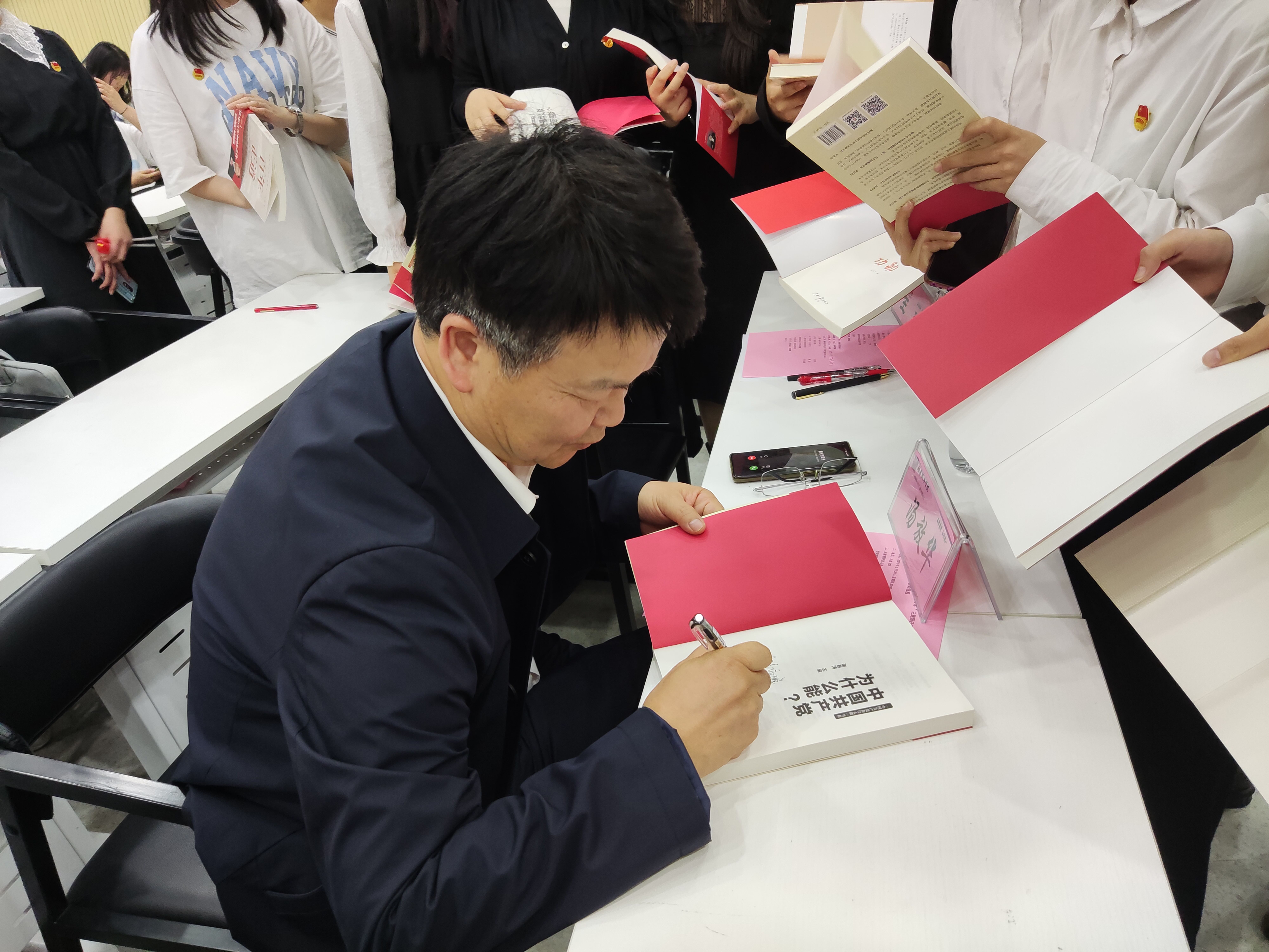 校长汤放华为同学签名赠书。
