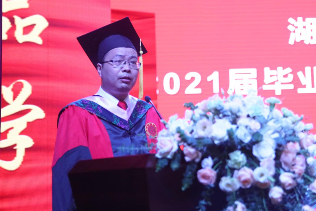 毕业典礼在庄严的国歌声中拉开帷幕。校长汤放华以《生逢盛世 肩负重任》为主题发表了热情洋溢的讲话。他代表学校向圆满完成学业即将奔赴新的工作岗位或继续求学深造的4400余名同学表示衷心的祝贺!向辛勤抚育同学们成长的父母和悉心教育同学们成才的老师致以最崇高的敬意!他指出,一代青年有一代青年的历史际遇,一代青年有一代青年的使命担当。站在“两个一百年”奋斗目标的历史交汇点上,身处科技革命和产业革命持续交融的新时代,面临机遇和挑战交织并存的新世界,同学们要秉承“品学兼修、知行统一”的校训精神,“心系人民、胸怀世界”,保持乘风破浪的昂扬姿态,承担起时代赋予的历史重任,方能不负这中华盛世。他希望毕业生们都能拥有“修齐治平、经国纬政”的才能,胸怀“经世济民、福泽万邦”的情怀,践行“天下兴亡、匹夫有责”的使命,把个人梦融入国家梦、民族梦之中,将回报家国、服务社会作为立德之源、立功之本,走好新时代赶考路,当好新时代答卷人。