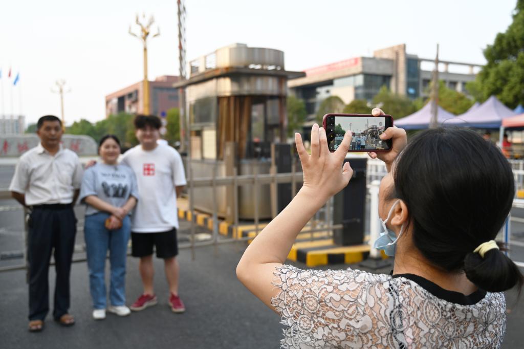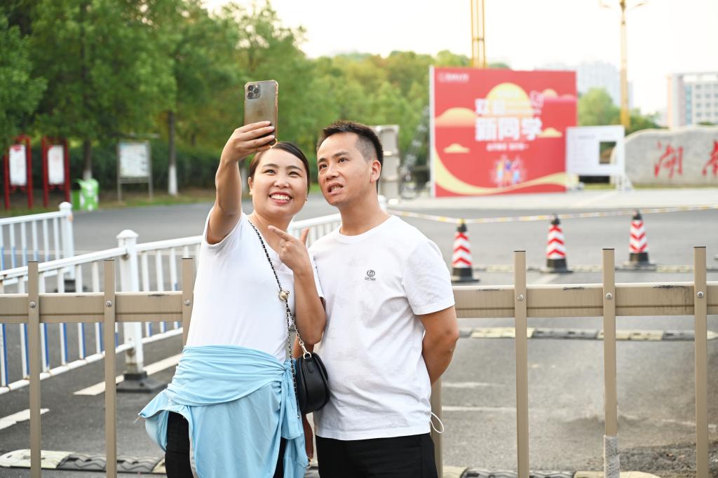 因疫情原因不能入校的新生家长在校门口拍照留念。