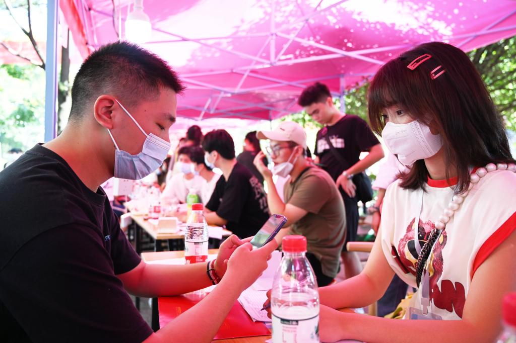 早上8点不到,学校校门口就已是人潮涌动。扫场所码、测量体温、查验健康码行程码、出示48小时内核酸检测阴性证明和录取通知书……在学校东、南、西、北四个校门处,“新橙子”们间隔1米排着长队,从临时搭建的报到通道中依次进入校园,并在志愿者的引导和帮助下前往迎新报到处。
