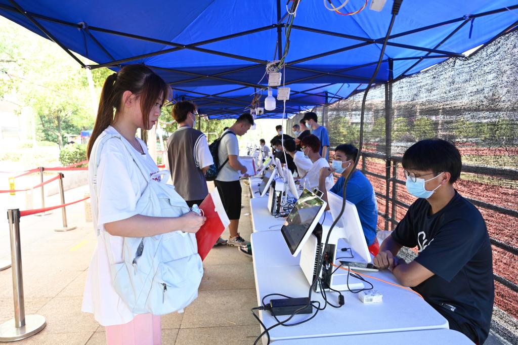 迎新点忙碌中的学生工作人员。