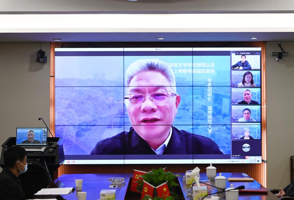 本网讯(记者 文彦波)11月29日上午,我校在办公楼一会议室召开教育部汉语言文学专业第二级认证线上考查专家见面会。专家组由湖南师范大学副校长唐贤清教授任组长,成员包括江西师范大学教育学院蒋喜锋副教授、江苏师范大学教师发展中心主任汪颖教授、云南文山学院质控中心主任王光斌教授、重庆市教师进修学校卢卫平正高级教师。省教育厅教师工作与师范教育处副处长缪高勇,校领导李建奇、汤放华、何旭娟、雷存喜、袁志成、陈列尊、吕贤军出席会议。会议由唐贤清主持。