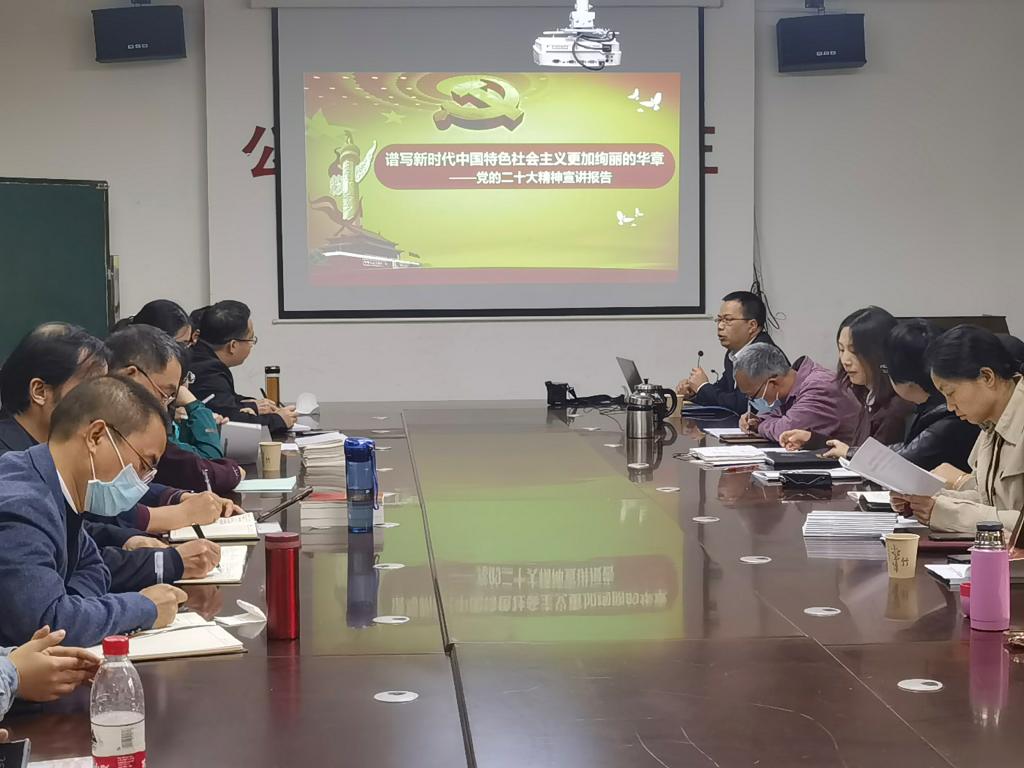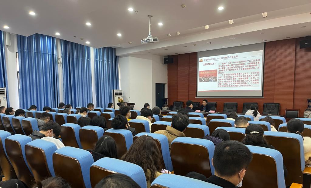 袁志成以“谱写新时代中国特色社会主义绚丽华章”为题,从全面领会党的二十大的主题及主要成果、深刻认识新时代十年的伟大变革及其里程碑意义、不断开辟马克思主义中国化时代化新境界、牢牢把握新时代新征程中国共产党的使命任务、贯彻落实新时代新征程的战略部署、用新的伟大奋斗创造新的伟业等六个方面,并结合自身学习体会和学院实际,对党的二十大精神作了全面系统的阐述。他表示,学院师生要全面系统学、深入思考学、联系实际学,全面理解报告的重要意义、科学内涵和实践要求,用党的二十大精神武装头脑、指导实践、推动工作。