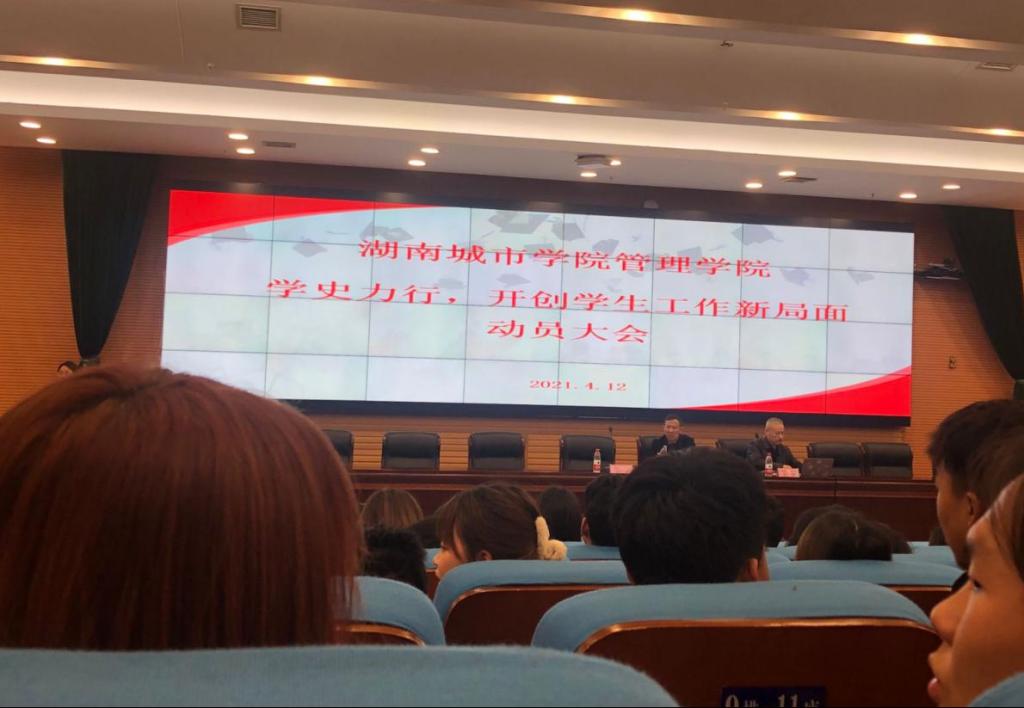 【党史学习教育】为使我校《中共开云在线开户首页/登录/入口关于开展党史学习教育的实施方案》落到实处,提高管理学院团学干部的政治自觉,树立正确党史观,扎实做好团学工作,4月12日晚7点,管理学院在图书馆报告厅召开了“学史力行,开创学生工作新局面”动员大会,管理学院党委书记徐习军、党委副书记王润华以及全体辅导员、团学干部和部分党员代表参与了本次大会,本次会议由组织员阳红珍主持。