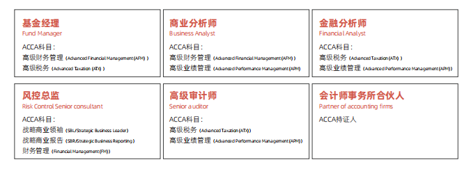 ACCA知识体系科目覆盖面广,未来职业选择更多元,方向更清晰。财务管理专业(ACCA创新实验班)学生未来将拥有广阔的就业选择,能在大型跨国公司、外资机构、会计师事务所、金融机构、政府部门等部门从事财务、审计、税务、商业分析、投融资、运营与管理等各类高薪职业。