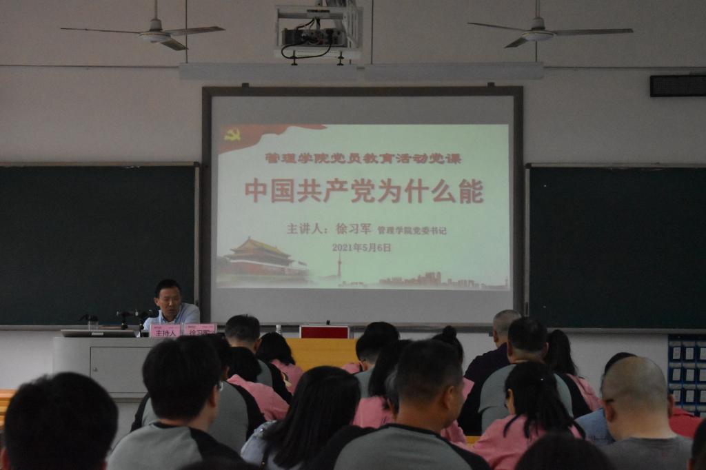 2021年5月6日下午14:00,管理学院在管理楼208教室召开党员大会,管理学院党委书记徐习军以“中国共产党为什么能?”为题,为全体党员上了一场专题党课。