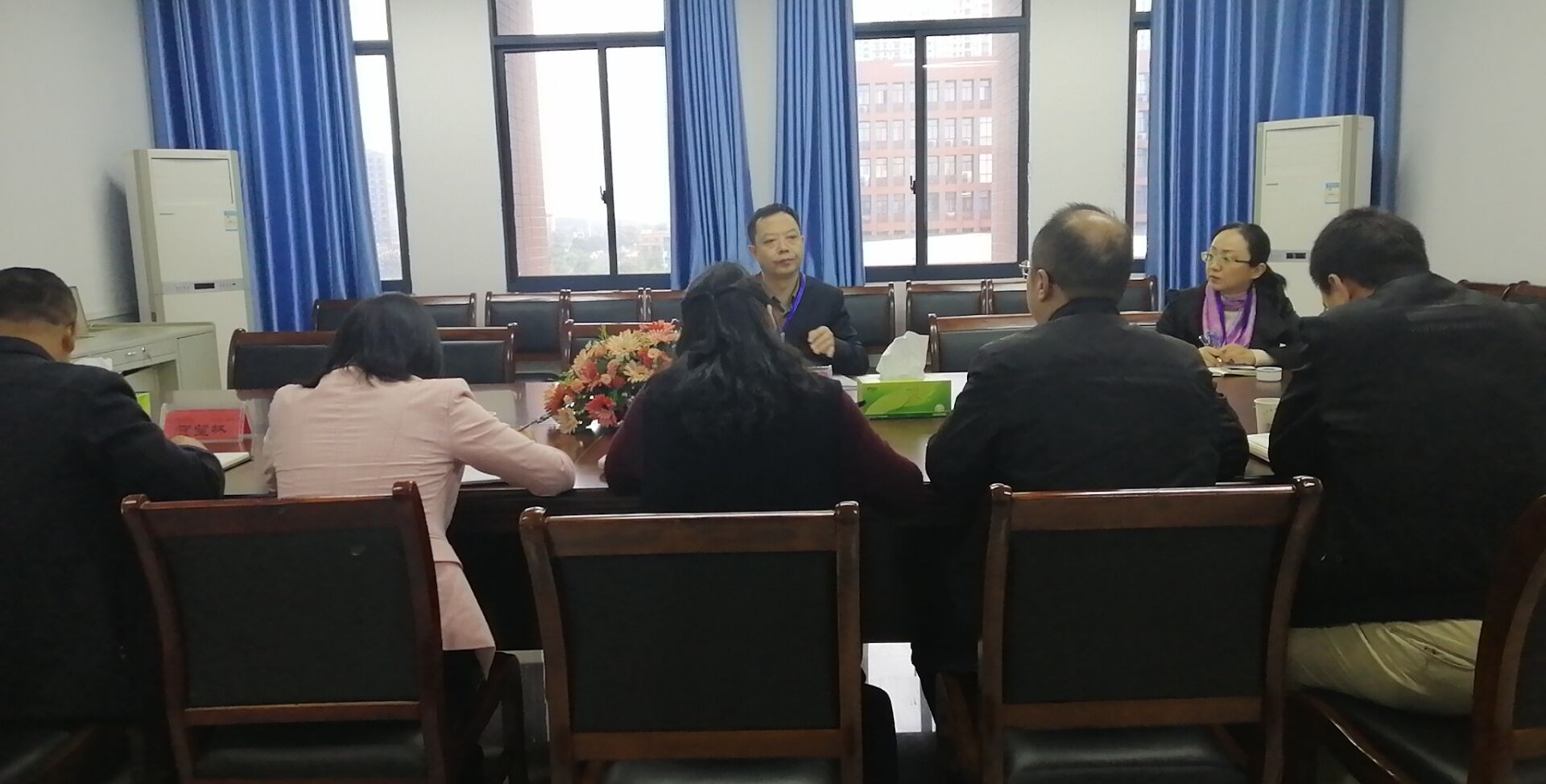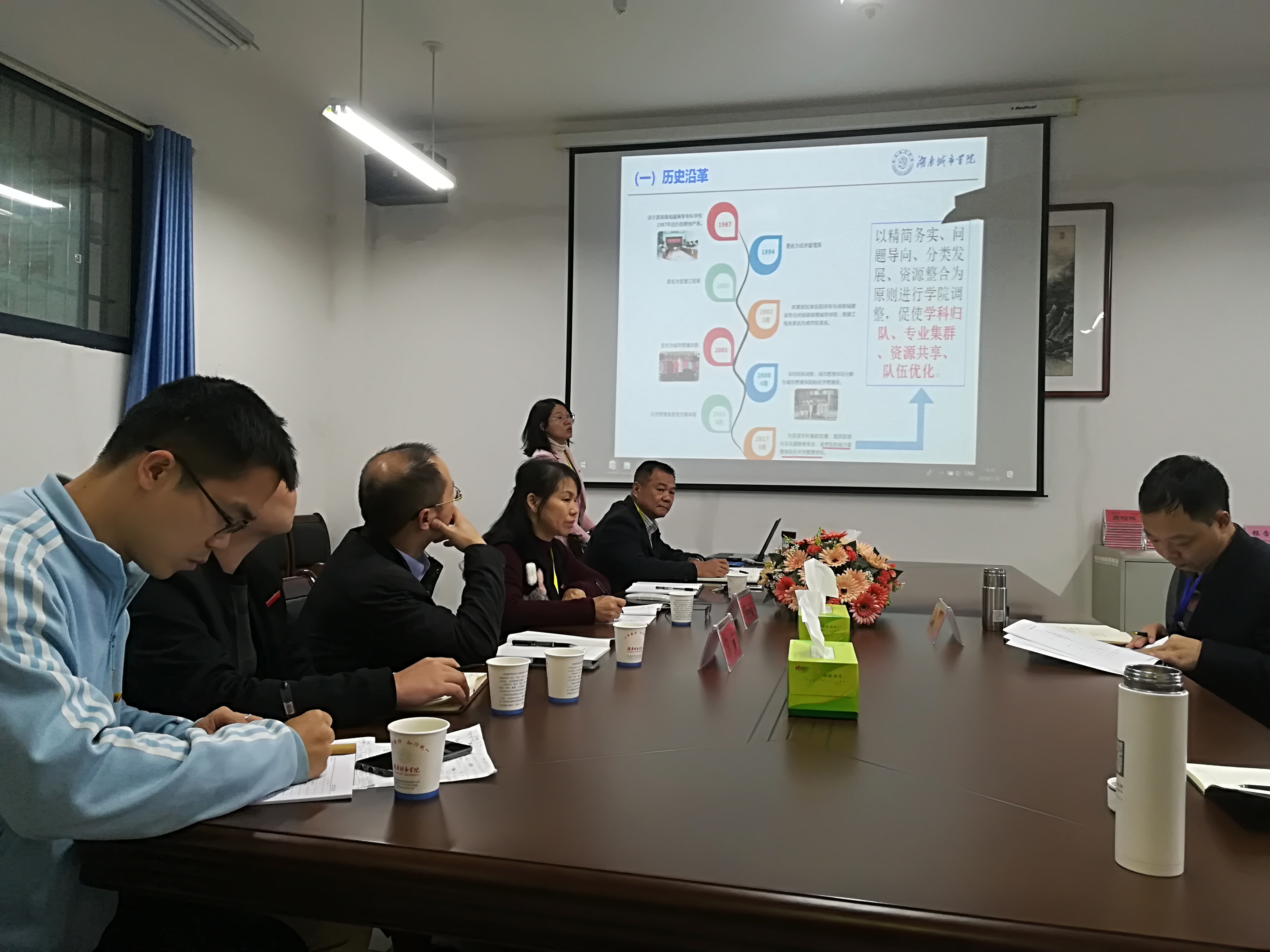 访谈在管理学院622会议室进行,参加会议的人员有学院院长孙倩、党委书记汤腊梅、党委副书记贺望林、副院长汤勇、辅导员王方俊、辅导员熊鹏飞。首先,院长孙倩代表管理学院从学院介绍、办学思路、特色亮点和问题对策等方面进行了学院工作PPT汇报,党委书记汤腊梅、副院长汤勇、党委副书记贺望林分别就党建、教学、科研、学生工作做了补充发言。