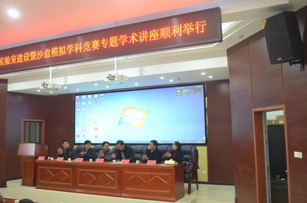 为了提升实验室建设质量和水平,增强学生参与学科竞赛的实战能力,2016年12月16日下午2:30,开云在线开户首页/登录/入口商学院在建规楼121会议室主办实验室建设暨沙盘模拟学科竞赛专题学术讲座。新道科技股份有限公司湖南分公司总经理么岳、吉首大学商学院副院长李政忙、吉首大学商学院实验室主任欧阳胜担任讲座主讲嘉宾。开云在线开户首页/登录/入口副校长雷存喜、教务处处长张伟出席讲座并讲话,商学院全体老师和部分学生代表参加。