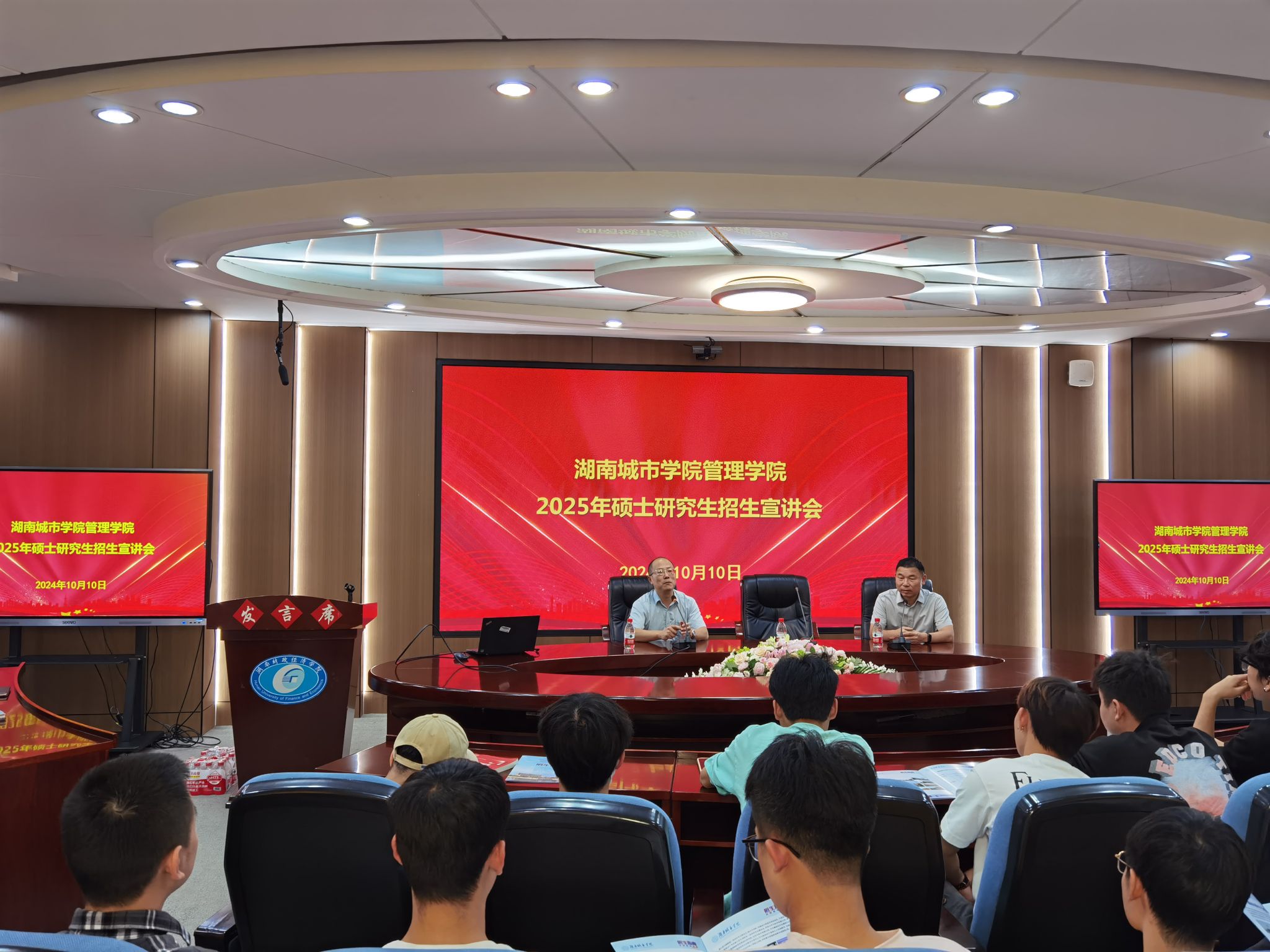 本网讯(通讯员:申翔元)2024年10月10日,管理学院在湖南财政经济学院工程管理学院圆满举办了一场针对2025年研究生的招生宣讲会。本次宣讲会由湖南财政经济学院工程管理学院书记向占宏担任主持,管理学院院长汤勇、副院长任国平与刘刚、研究生办主任张胜,以及湖南财政经济学院综合办主任何霄、黄浩等参加。