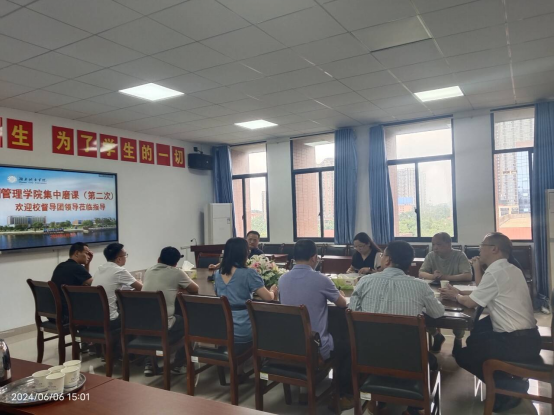 本网讯(通讯员 尹罡)6月6日下午,为深入贯彻落实学校关于做好新一轮本科教育教学审核评估系列工作精神,进一步提升学院教师的整体教育教学水平,管理学院在管理楼622室举行第二轮集体“磨课”活动。本次活动特邀学校教学督导团团长方乐教授亲临现场指导,管理学院院长汤勇、副院长刘刚以及学院督导团全体成员参加听课,“磨课”活动由副院长刘刚主持。