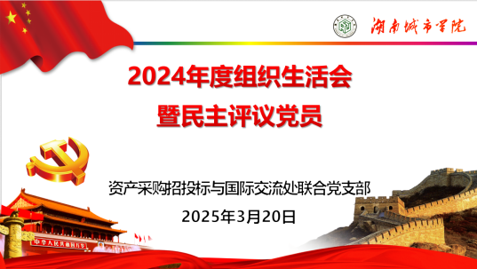 2025年3月20日下午,资产处(采购与招投标管理处)与国际交流处联合党支部在一办131支部党员活动室开展主题党日活动,主要内容包括:2024年度组织生活会、民主评议党员、支部书记讲专题党课,支部在校的全体党员参加。
