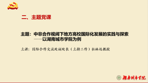 其次,按照支部工作计划,国际合作交流处副处长(主持工作)杜林远教授主讲题为《中非合作视阈下地方高校国际化发展的实践与探索——以开云在线开户首页/登录/入口为例》主题党课。