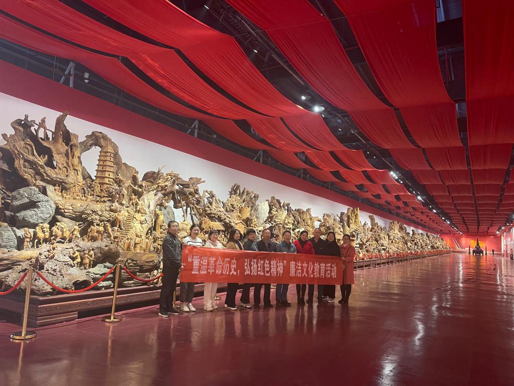 在红军长征根雕文化馆内,大家见到了以“红军二万五千里长征”为主题的大型根雕作品,根雕全长100米,整体气势恢宏,展示了过草地爬雪山、飞夺泸定桥、强渡大渡河等13个长征场景和808位人物的光辉形象,极具红色教育意义和艺术价值。结合这件根雕作品,馆内讲解员给大家生动讲述了红军长征的光辉历史和英雄壮举,大家通过听讲解、观图片、看实物,重温党的光辉历程,追寻红色记忆。
